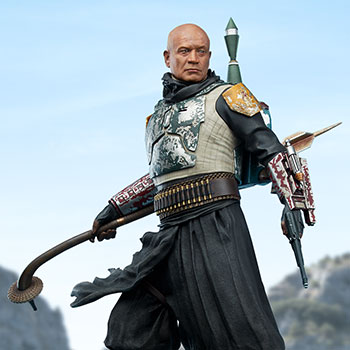 The Boba Fett Premium Format Figure measures 22.38” tall and 15” wide, standing on a rocky Tython™ base, the site of the battle against Moff Gideon’s™ Imperial forces. The polystone statue is fully sculpted and features detailed paint application to recreate the weathered state of his salvaged armor. Boba Fett includes both an unhelmeted and helmeted portrait and he comes fully equipped for battle with his jetpack, a gaffi stick™, and a blaster pistol. With intricate cloth-like textures and dynamic motion designed into the pants and sash of his costume, Boba Fett is ready to join the fight in your collection.