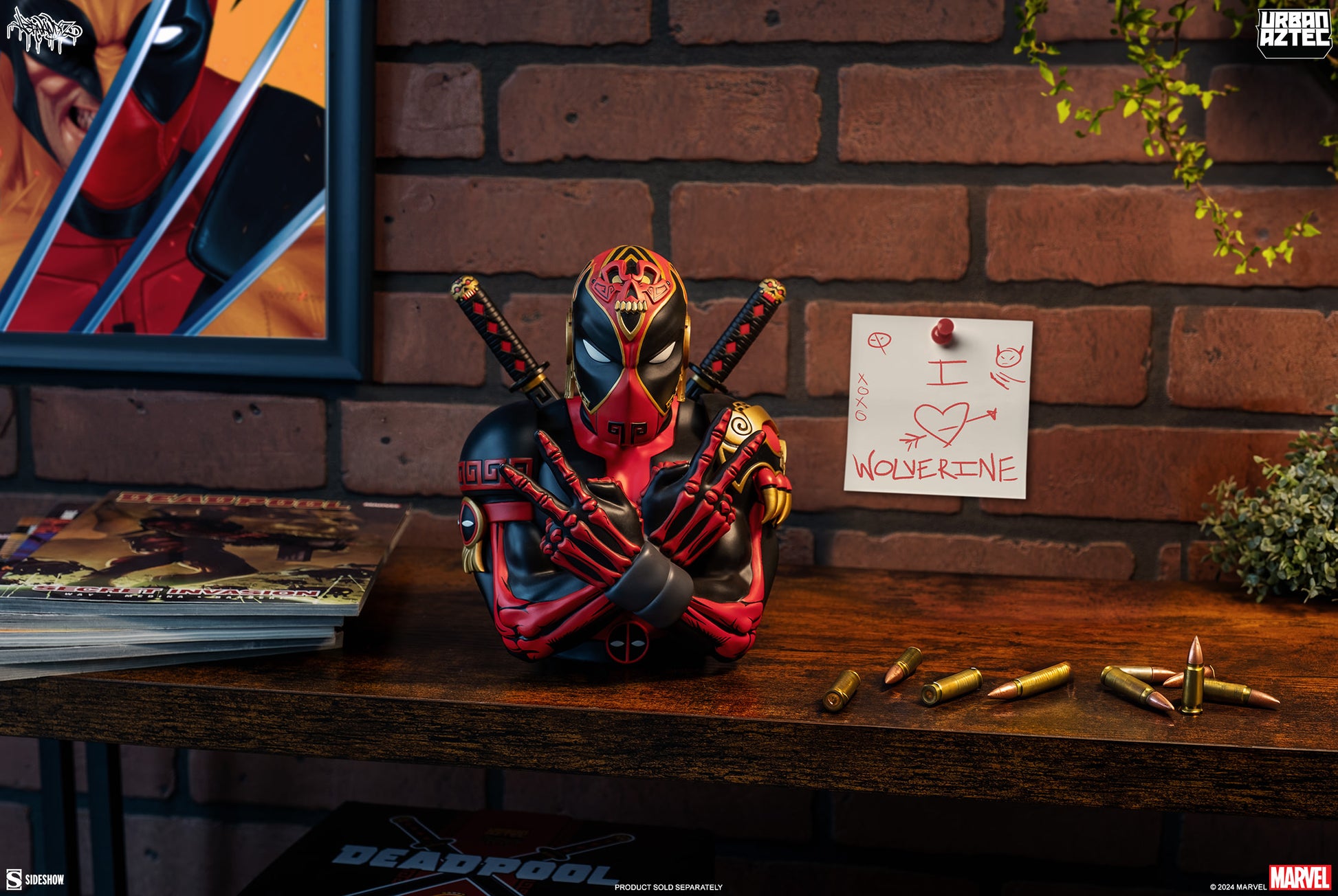 The Merc with a Mouth is here to kick your Aztec! Pop culture meets ancient culture in the Deadpool Designer Collectible Bust by artist Jesse Hernandez, which reimagines Wade Wilson with a gold-accented Maya and Aztec influence. Sculpted as an homage to Urban Aztec’s own Wolverine designs, this exciting Marvel collectible lets his incredible style do all the talking.