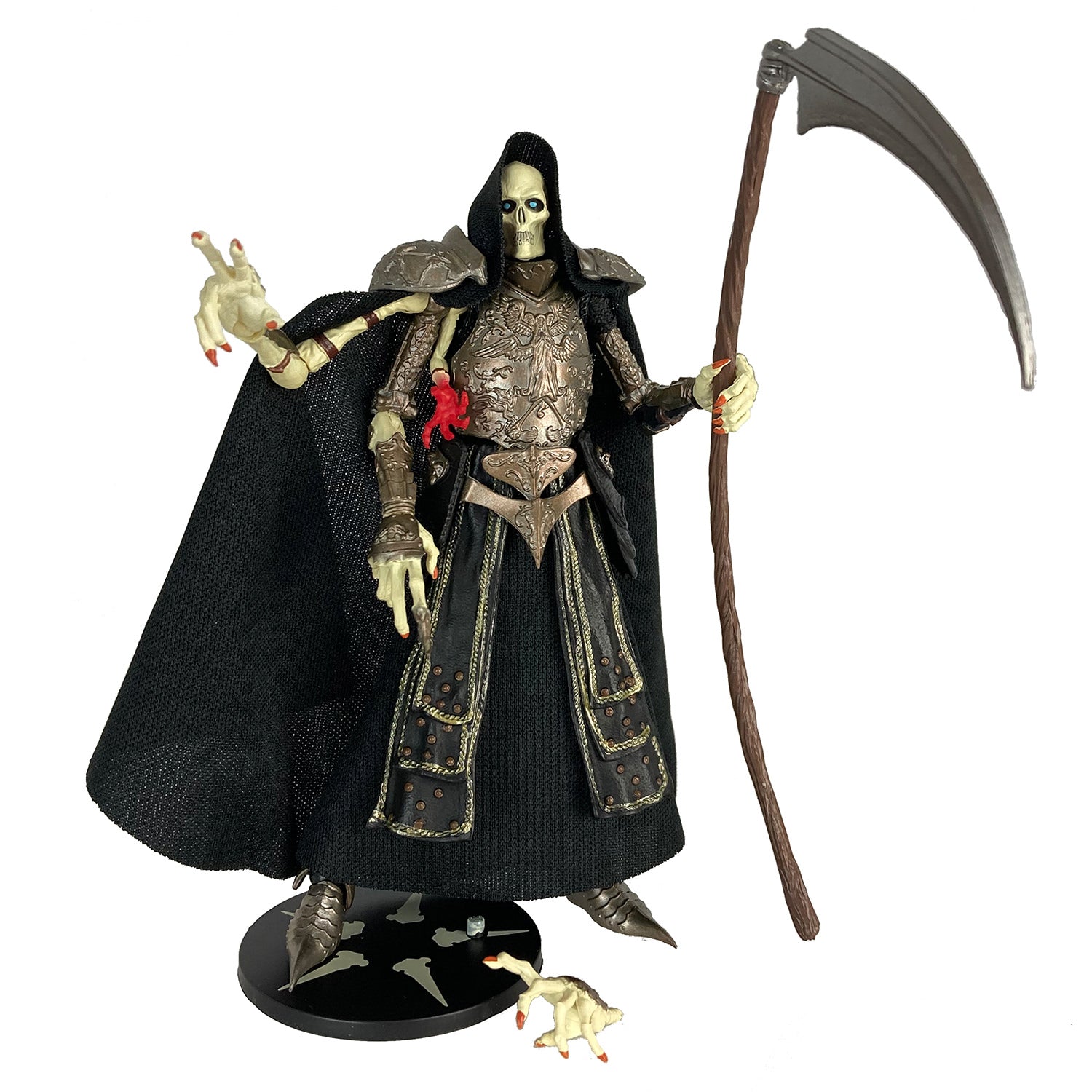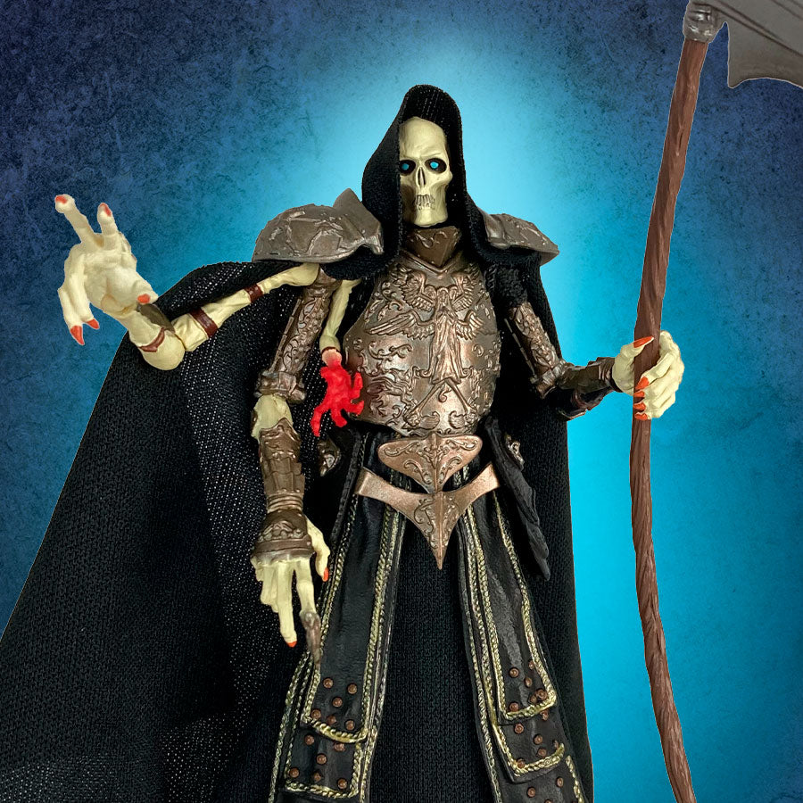 This 1:18 scale detailed and fully articulated action figure comes packed with extra hands to securely grip accessories, removable secondaries including soft goods cape and giant scythe. This collectible toy includes one window boxed action figure with accessories and figure stand.