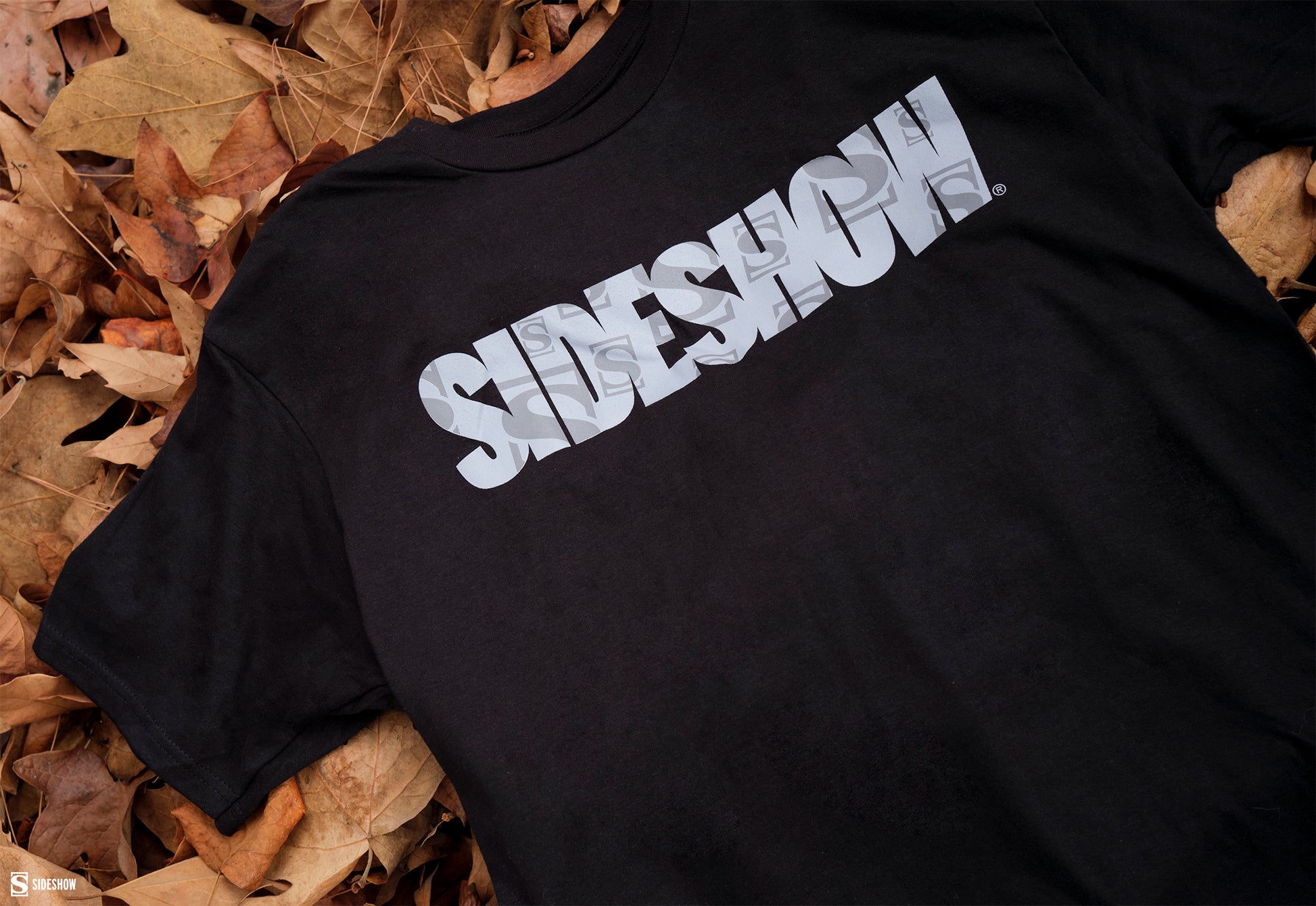This black classic crew neck T-shirt is made of 100% cotton and features a white and gray Sideshow “S” logo-patterned “SIDESHOW” on the front. On the back of the shirt, a white Sideshow “S” logo sits above the phrase “Fueled by Fandom.”