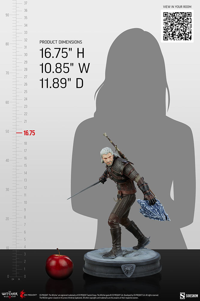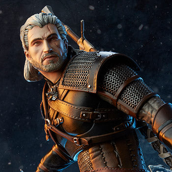 The Geralt Statue measures 16.75” tall and 10.85” wide with an ice-themed base evoking the apocalyptic White Frost as he stands ready for battle, a sword in one hand and the severed head of a hound of the Wild Hunt in the other. Geralt features a fully sculpted costume expertly recreating the rugged chain and leather look of his battle armor. A stern portrait captures his signature features — white hair, piercing yellow eyes, facial scars, and his magic-detecting wolf medallion. With frost-covered boots and a whole host of signs and strategies at his command, this fabled butcher of beasts will fight to the last against the tyranny of the Wild Hunt.