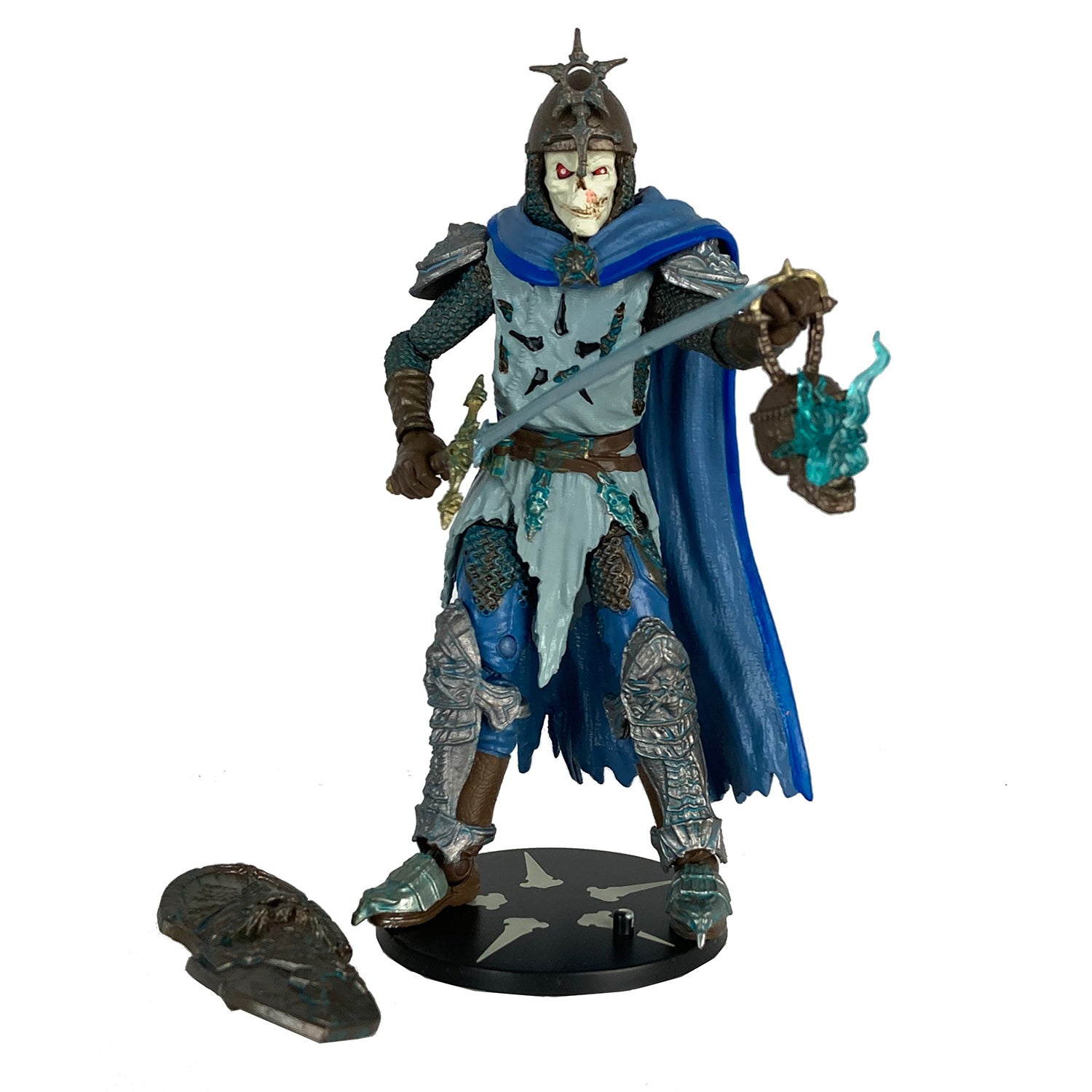 This 1:18 scale detailed and fully articulated action figure comes packed with removable secondaries, well-worn sword and shield, and magical skull artifact. This collectible toy includes one window boxed action figure with accessories and figure stand.