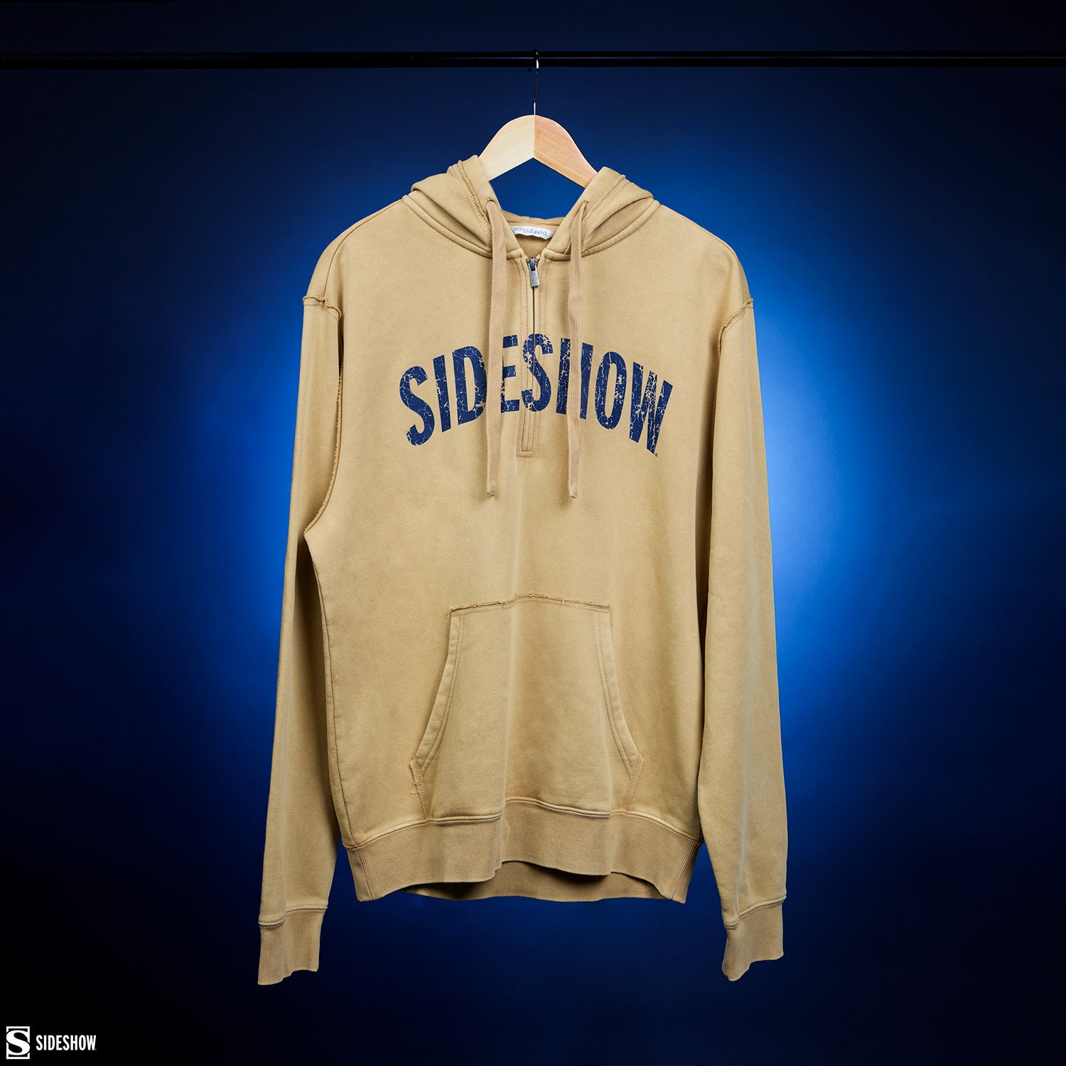 This wheat-colored hoodie features cotton/poly fleece construction, a pouch pocket, a half-length zipper, and drawcords on the hood. The chest features “Sideshow” in a blue distressed design for a simple, stylish way to express your fandom.