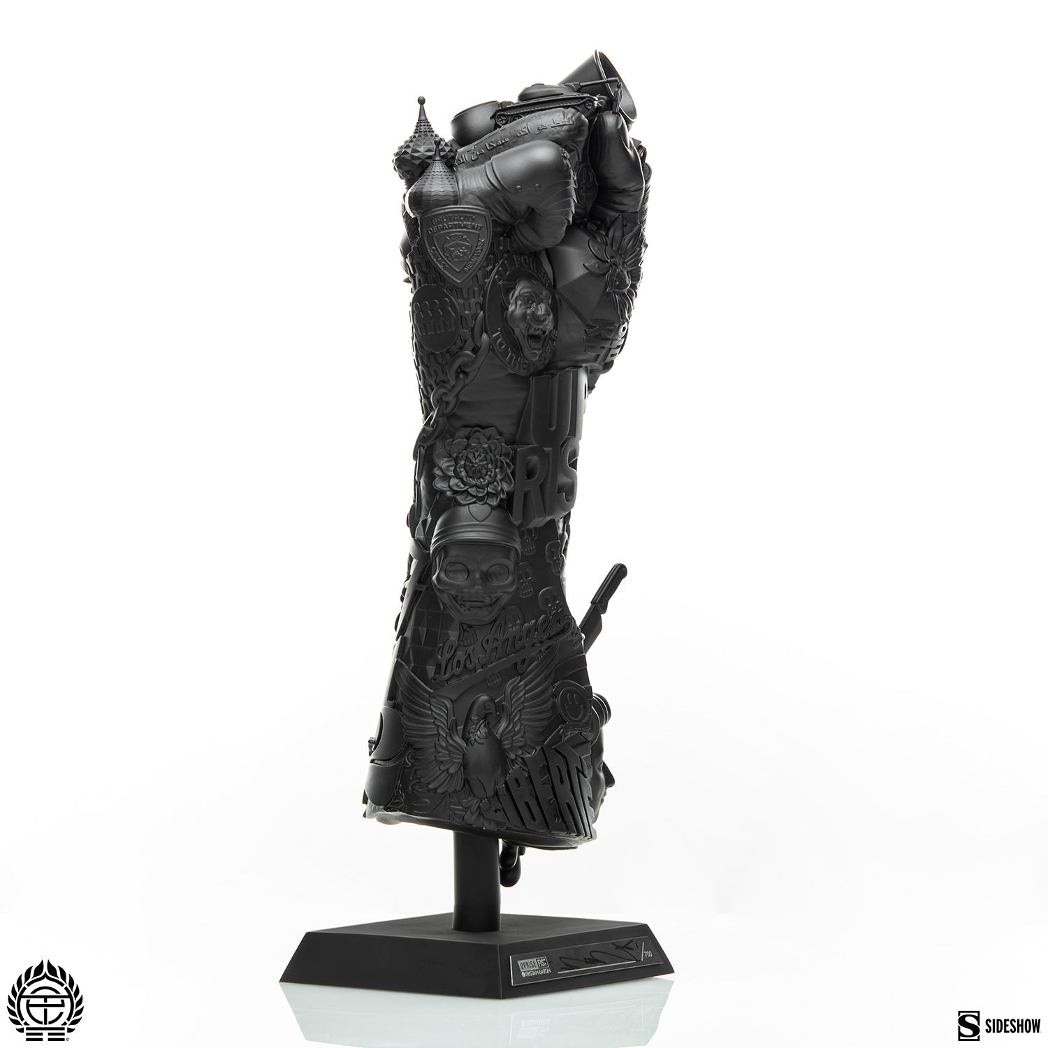 The Uprise Fist Fine Art Statue comes in a limited edition of only 700 pieces. Each individually numbered statue features a metal base plaque that is hand-signed by the artist, along with a certificate of authenticity. This limited-edition statue comes securely packaged in a custom designed art box featuring a selection from the Uprise mural series, a statement by Eaton, and a visual legend to identify the key moments represented in the sculpture. First debuted at the DEAD PRESS POP-UP art exhibition featuring Tristan Eaton x Sideshow, the Uprise Fist Fine Art Statue is an inspiring, eye-catching statement piece in any home.