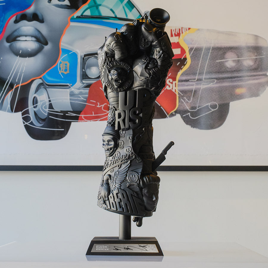 World-renowned painter and designer Tristan Eaton has received critical acclaim and a dedicated following for his large-scale public murals, of which there are about 100 worldwide. His distinctive graphic style, unique voice, and innovative ideas often blur the lines between commercial and fine art. The Uprise Fist Fine Art Statue pays tribute to the relentless spirit and struggle of human revolution throughout the ages, captured in Eaton’s signature collage style. The sculpture measures 16.5” tall x 5.75” wide x 5.75” deep and is covered from top to bottom in bas-reliefs depicting pivotal moments of rebellion in world history. Powerful symbols and scenes combine into a tapestry of change, drawn together in the shape of a fist rising up in protest against injustice.