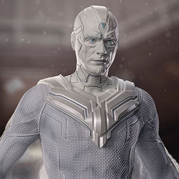 Above the destroyed remains of a library pillar located in the town of Westview is the synthezoid avenger, an artificially created humanoid being. After being revived by his beloved sorceress wife, through the Magic of Chaos, he rises, floating, with clenched fists and a grim countenance, ready to combat any threat to his family, even though he is a ghostly version of his reassembled body, without his memories and his love for Wanda Maximoff. Inspired by the latest episode of the Disney+ streaming TV series Wandavision, Iron Studios presents the "White Vision - Wandavision - Legacy Replica 1:4 Statue", where the hero faced himself in defense of his beloved wife and children.